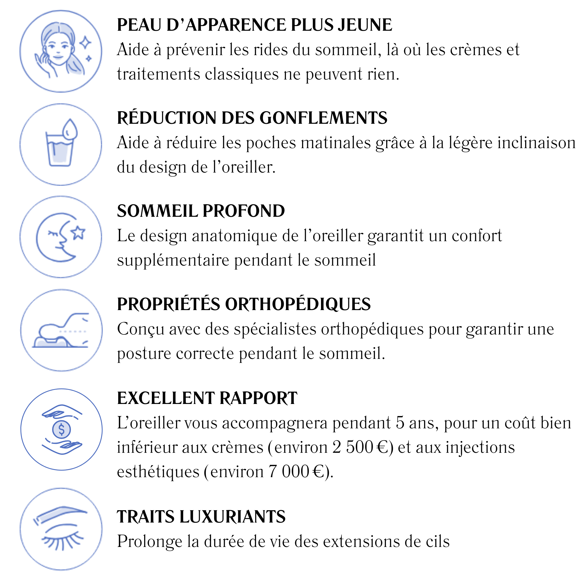 - Prévient les rides du sommeil en limitant la compression du visage.